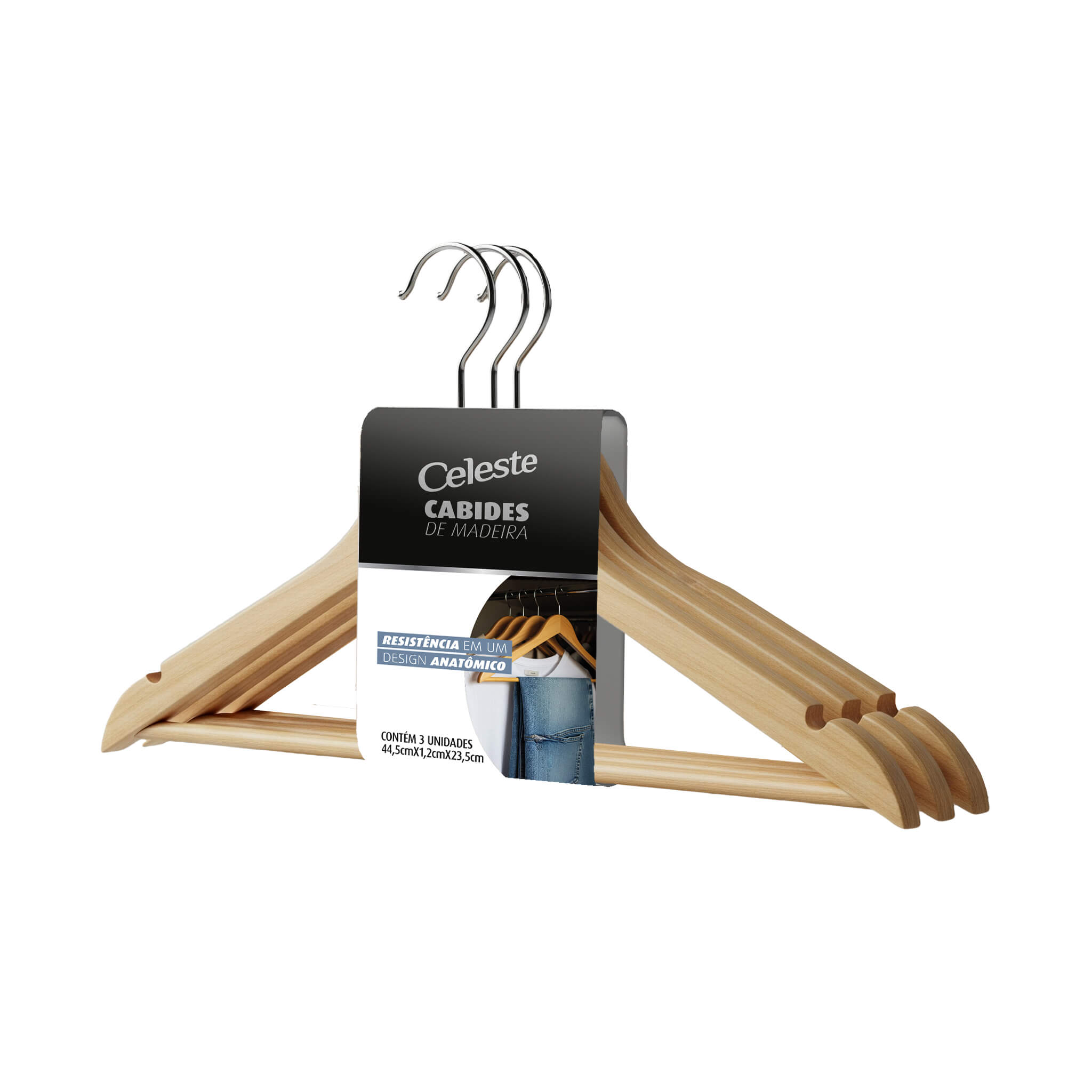 A combinação da madeira polida com o cabo de aço confere durabilidade superior e um toque de modernidade. O acabamento liso evita que fios sejam puxados, enquanto as cavas laterais garantem que vestidos e blusas de alça permaneçam no lugar. É o acessório definitivo para quem busca um closet funcional e elegante.